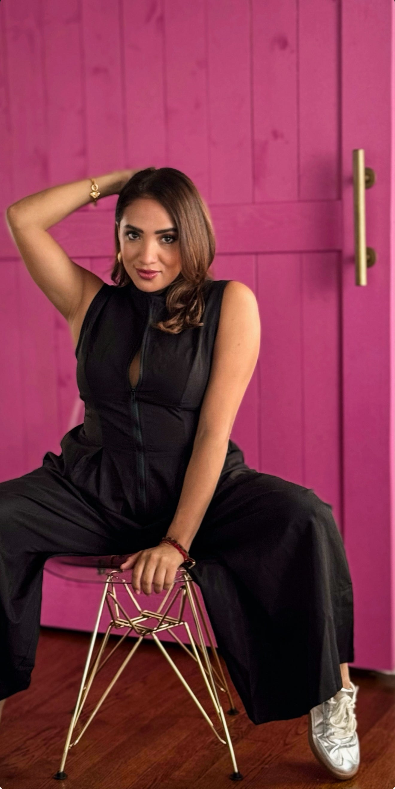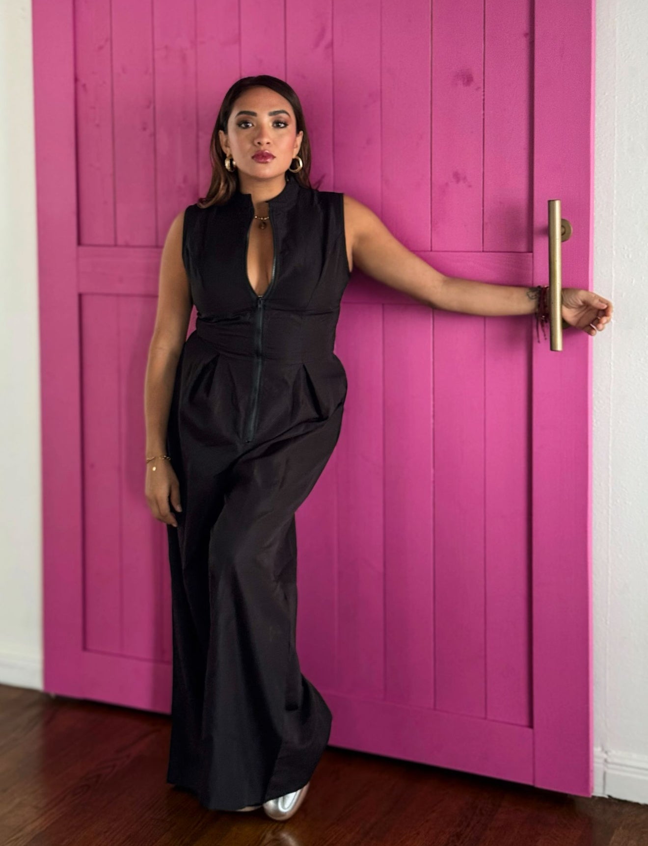 A structured black sleeveless jumpsuit that radiates sophistication. With a fitted bodice and wide-leg silhouette, this piece transitions flawlessly from a day meeting to a night out with heels and gold accessories.