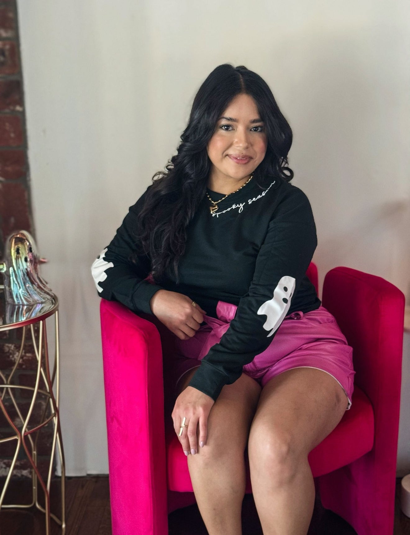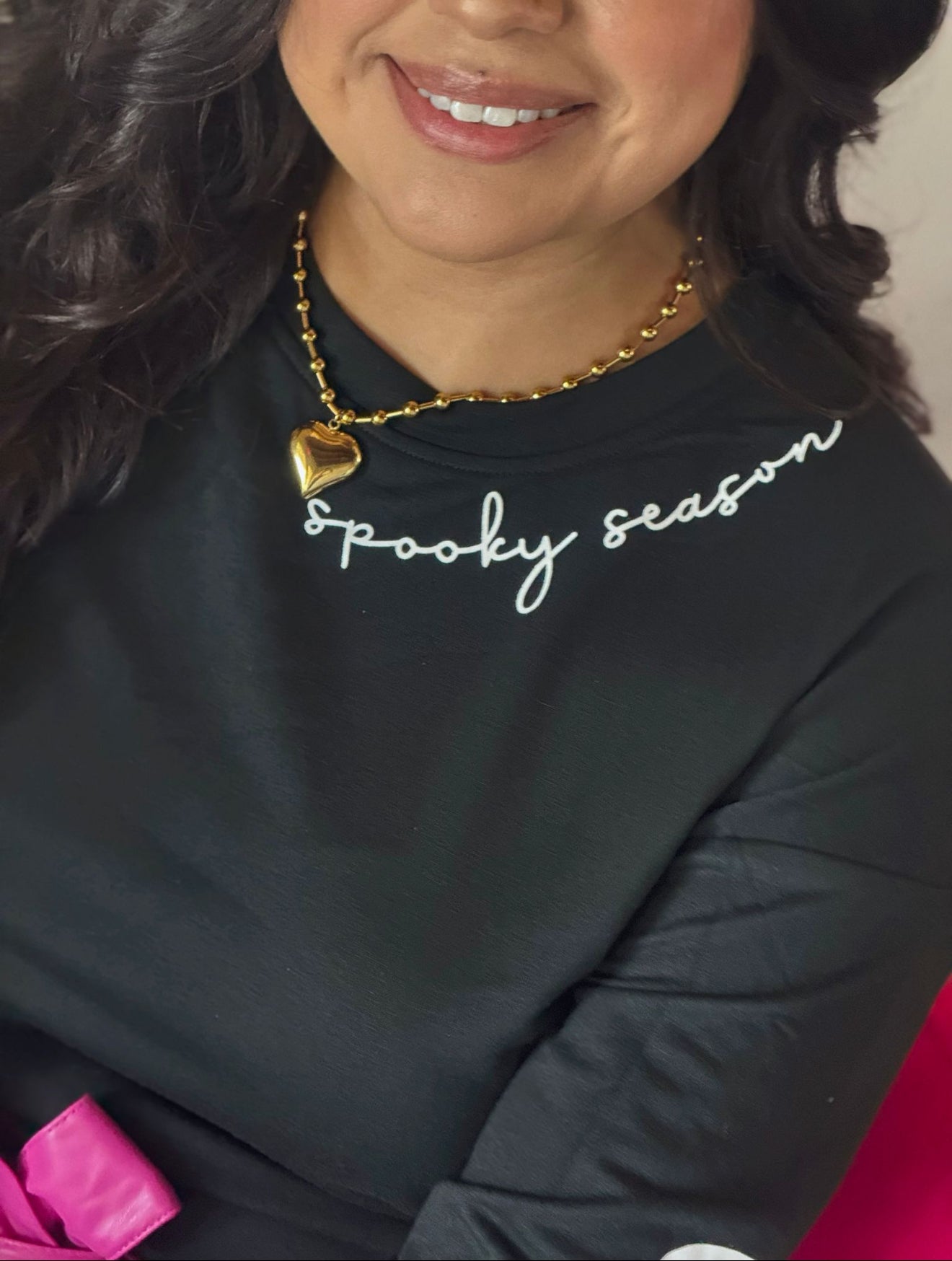 The Spooky Season Sweater is all treats, no tricks. With playful ghost graphics on each sleeve and “spooky season” embroidered across the neckline, this cozy black pullover is the perfect mix of comfy and festive. Pair it with denim for pumpkin patch outings, movie marathons, or casual Halloween fun. A must-have piece to keep you cozy and cute all October long.